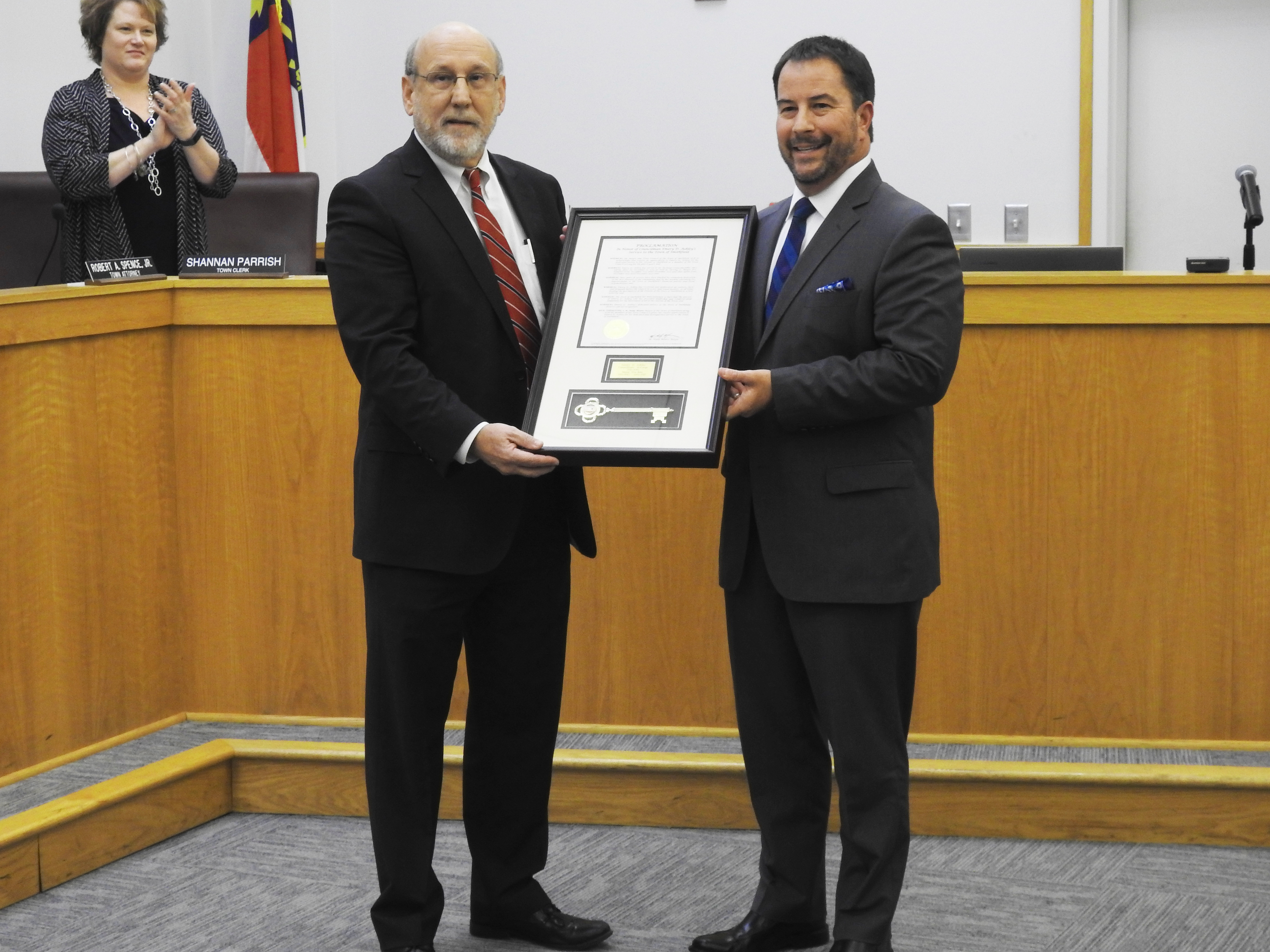 Mayor Moore presented Ashley with an honorary Key to the City for his 8 years of service as a town councilman. Ashley thanked his family for their support and for the citizens of Smithfield for allowing him to serve. “It’s where the rubber meets the road. Seven people discuss issues and share opinions and hopefully come up with the right decision. It’s not an easy task,” Ashley said after receiving the honor and reflecting back on his service. “I’m going to miss being up here. I’ve enjoyed it. Thank you very very much.”