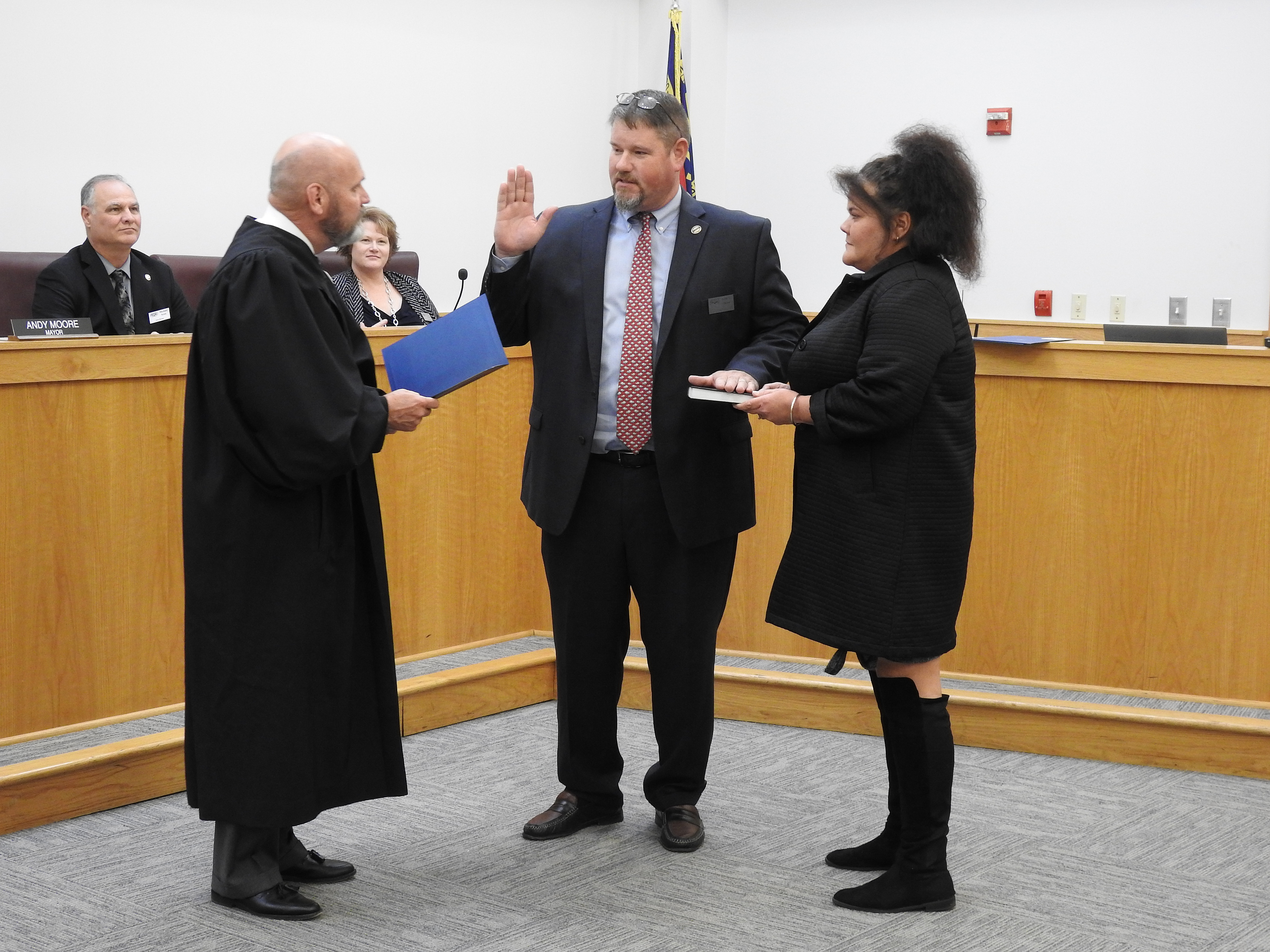 Smithfield Mayor Andy Moore and three town council members who won election in November received their Oaths of Office Tuesday night at the Smithfield Town Hall.