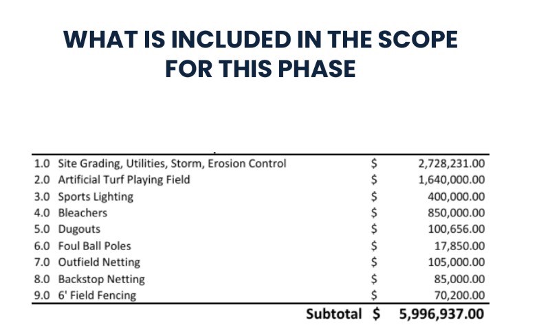 Town officials have said the stadium can be built for $6 million. However, information presented at the meeting indicated the project is already estimated at $5,996,937 million without several key components.