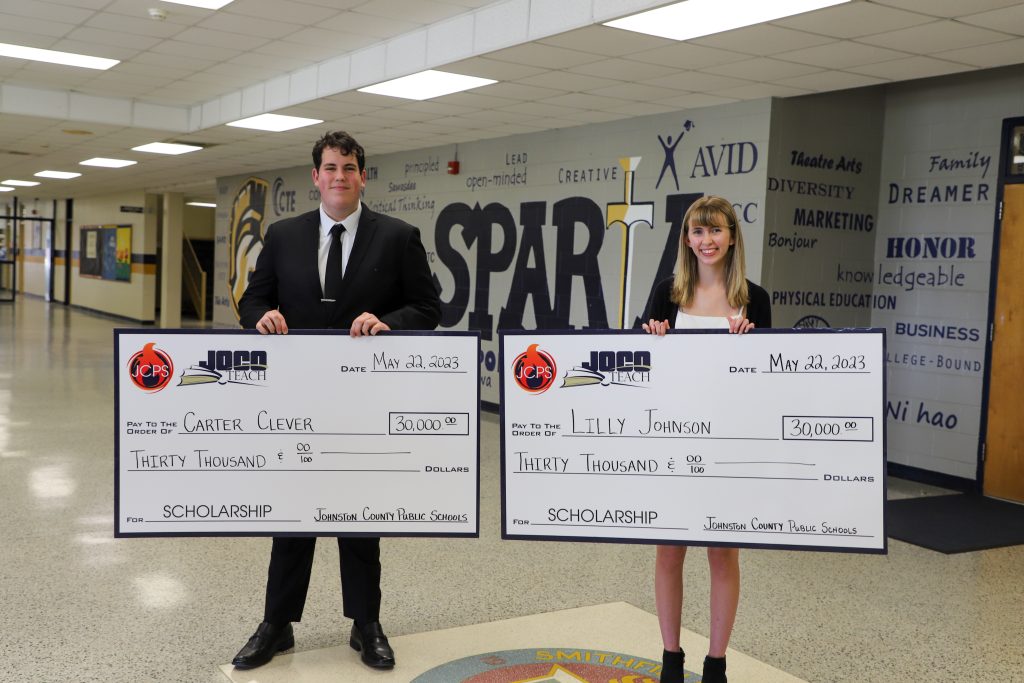 SMITHFIELD – Smithfield-Selma High seniors Carter Clever and Lilly Johnson each received Johnston County Public Schools’ first JoCo TEACH scholarship at a special check presentation at the school on May 22.
