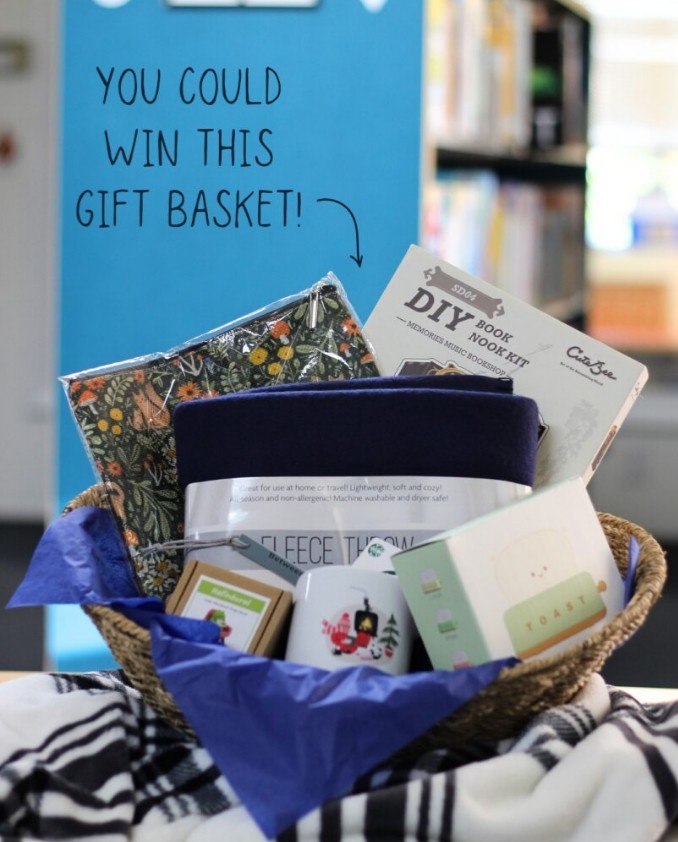 Readers are invited to complete nine simple activities arranged like a bingo card. Options include reading in pajamas, enjoying a baked treat while reading, visiting the library on a chilly day, sipping a warm drink while turning pages, or picking a story set in a snowy landscape. Completing all nine activities earns participants a chance to win a gift basket filled with treats for book lovers.
