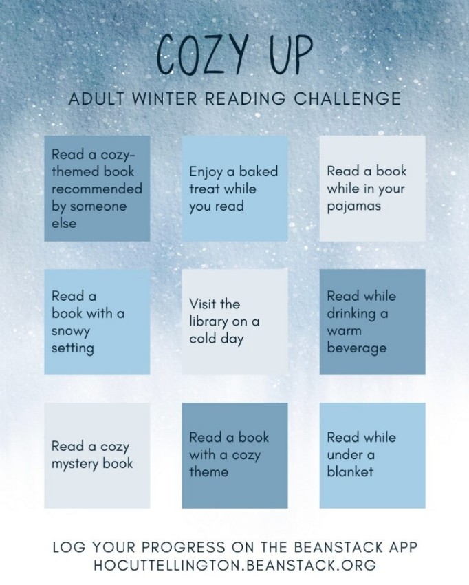 The Cozy Up Winter Reading Challenge is open to adults and encourages readers to embrace the season through stories, comfort, and creativity. Whether curling up under a blanket, diving into a cozy mystery, or exploring a book with a winter theme, the challenge offers a welcoming way to make reading part of your routine.