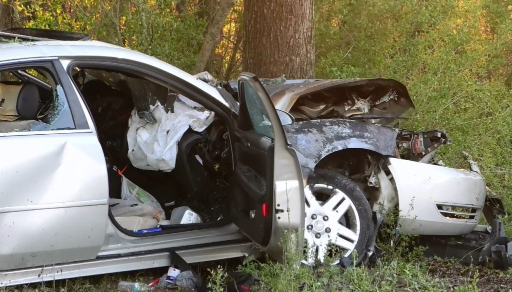 The car reportedly traveled off the roadway in a curve, through a field, then struck a tree head-on. The engine compartment suddenly burst into flames.