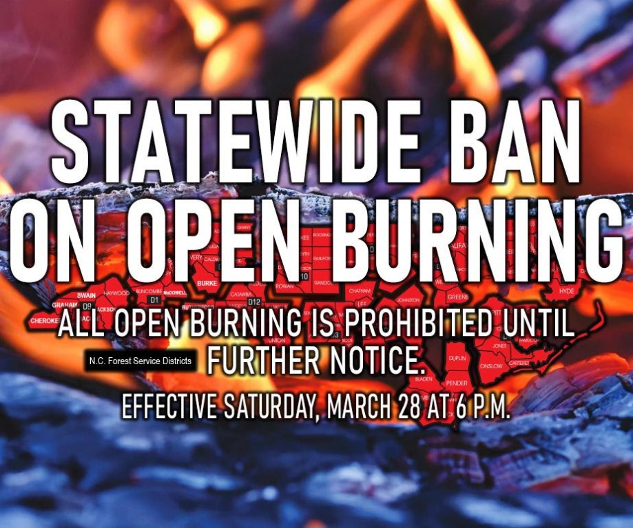 RALEIGH, N.C. – Due to increased wildfire risk, the N.C. Forest Service has issued a ban on all open burning and has canceled all burning permits statewide effective 6 p.m. Saturday, March 28 until further notice.