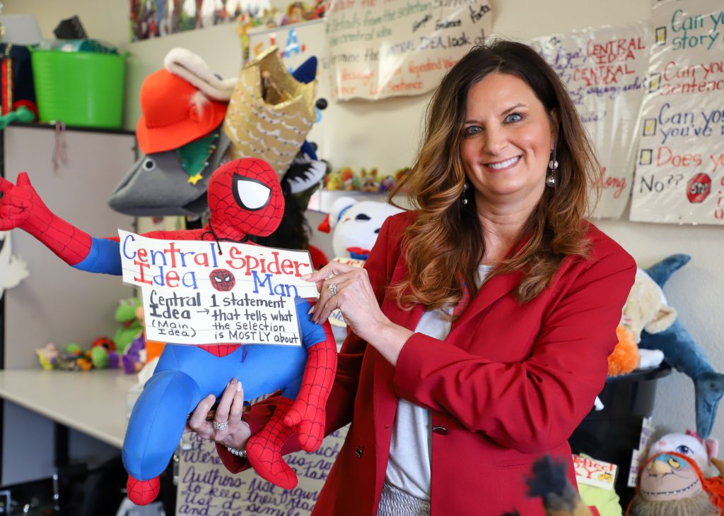 CLAYTON – Arnie the Apostrophe was one of the main characters discussed during Ms. Jennifer Medlin’s classroom visit this morning by Superintendent Dr. Eric Bracy, Area Assistant Superintendent of Elementary Schools Patty Whittington, Riverwood Elementary principal Leigh White, and Chief Academic Officer Anna Kuykendal.