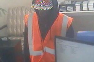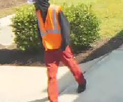 The suspect was described a black male between the age of 30 and 40, 5 foot 9, with short goatee-style facial hair, wearing a black hooded sweatshirt, white striped hat with red designs, red pants, red shoes and an orange reflective safety vest.