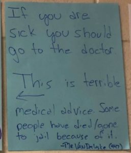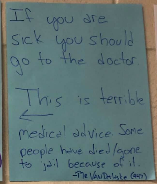 According to several emails received by JoCoReport, a teacher Brian VanDerlaske, allegedly placed his own message beside the Bible verse with an arrow pointing to the scripture stating, “If you are sick you should go to the doctor. This is terrible medical advice. Some people have died/gone to jail because of it.” Next to his comments VanDerlaske also posted a copy of an online news article entitled, “Parents given jail terms for relying on prayers to save dying daughter”.