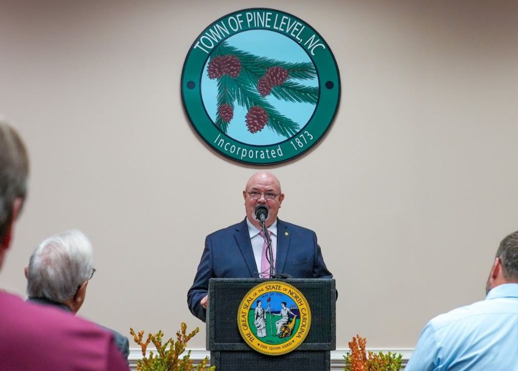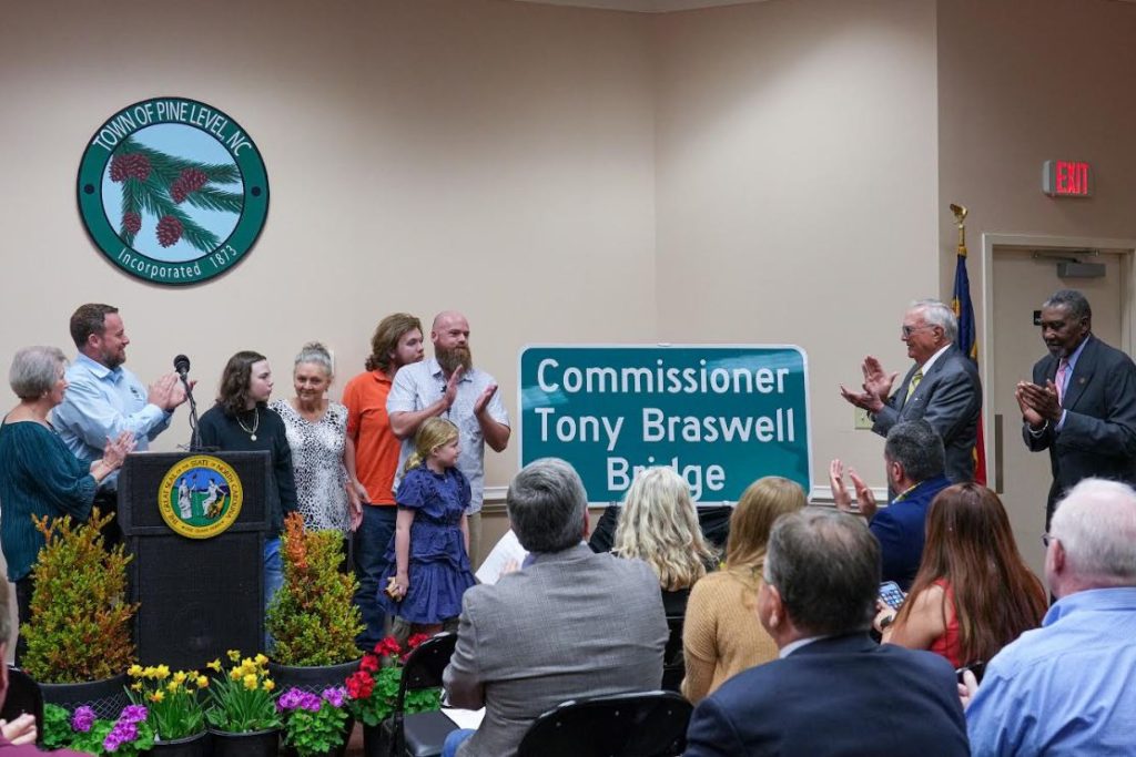 PINE LEVEL – Friends and family packed Pine Level Town Hall on Thursday to celebrate former Johnston County Commissioner Tony Braswell and to take part in the official dedication ceremony of a bridge named in honor of the late Commissioner. Located on US 70 Business East at the Peedin Street Extension in Pine Level, the bridge honors the Vietnam War veteran and dedicated public servant.