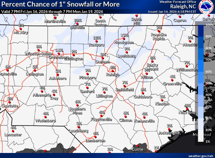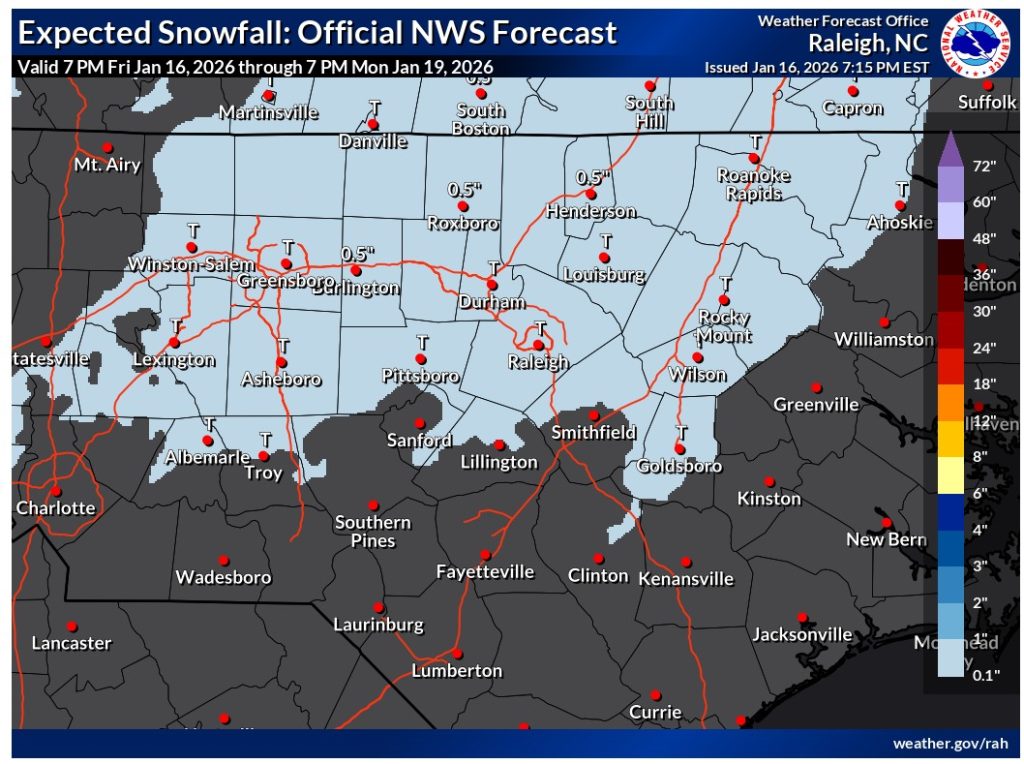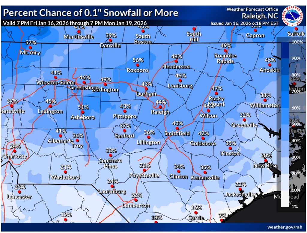 Temperatures are expected to be just cold enough for a trace of snow accumulation, mainly on grassy and elevated surfaces. The NWS notes the chance for any accumulating snow appears to be over the northeast Piedmont, from Raleigh north and northeast.