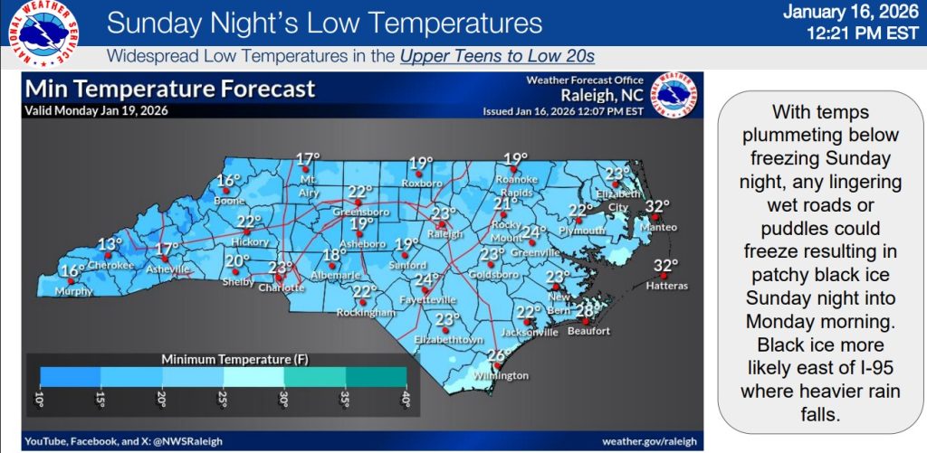 Officials warn that any lingering wet roads or puddles could freeze as temperatures plunge below freezing Sunday night, creating the potential for patchy black ice into Monday morning. The NWS advises that areas east of I-95, where heavier rain falls, are particularly at risk.