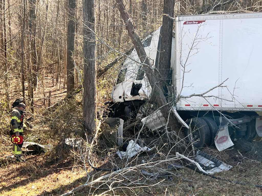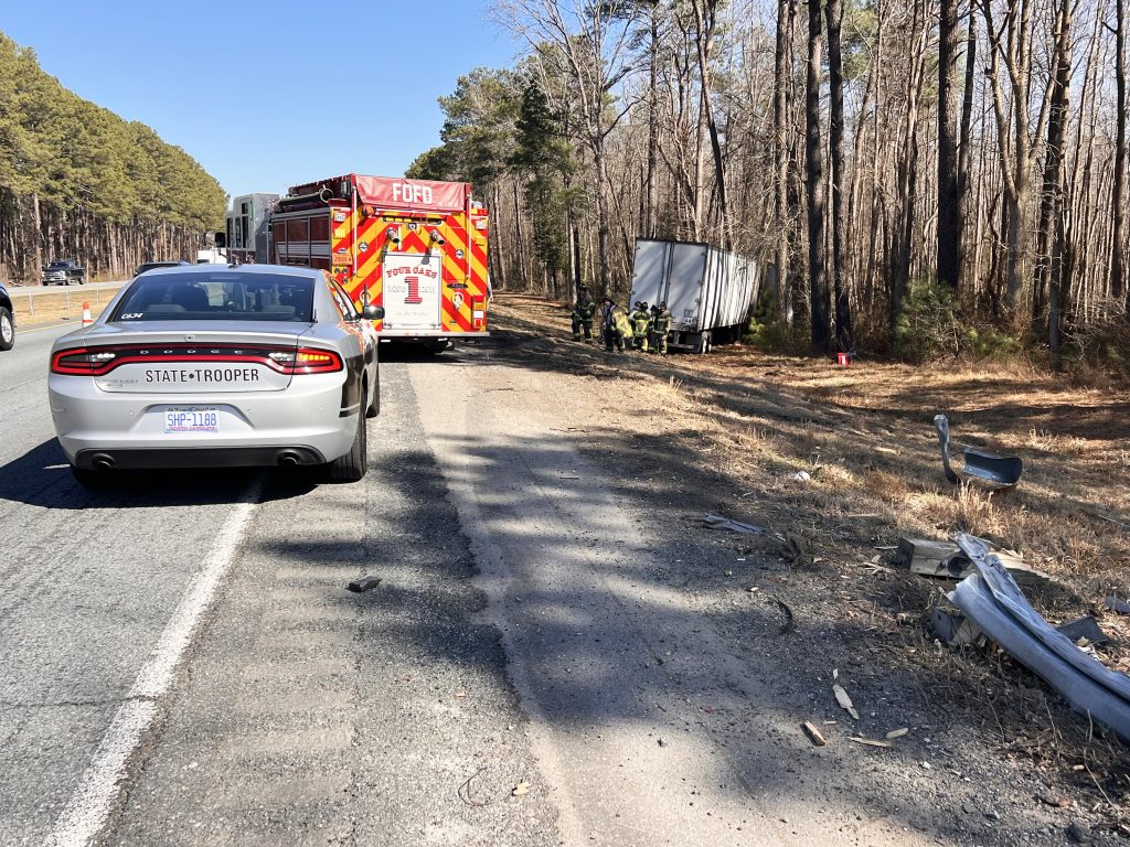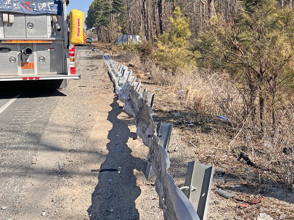 The tractor trailer struck and damaged a long stretch of guardrail along the right shoulder before leaving the roadway and careening into a wooded area.