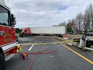 At 3:29pm Saturday, troopers said Linen was traveling in his red 18 wheeler northbound on I-95 near the 78 mile marker, just south of Benson. Linen was in the left lane and began to merge into the right line to pass a white Honda Accord also traveling northbound. The semi collided with a blue Honda Accord in the right lane, then swerved back left striking the white Honda, spinning it around then striking the white Honda a second time. The white Honda and tractor trailer then went into the median and through the guardrail into the southbound lanes of I-95.