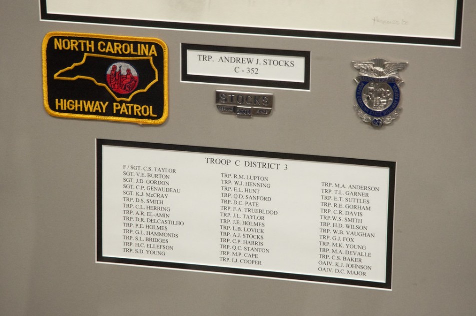 An Army and Marine veteran, Trooper Stocks died on September 9, 2008 when his patrol car collided with a truck on Ten Ten Road near Garner while responding to a traffic accident.