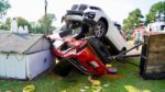 The BMW ran off the roadway and struck a ditch culvert and the right side of the Ford, before coming to rest on top of the Ford SUV after impact.