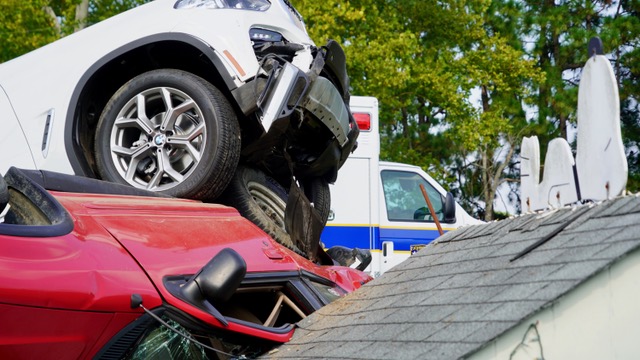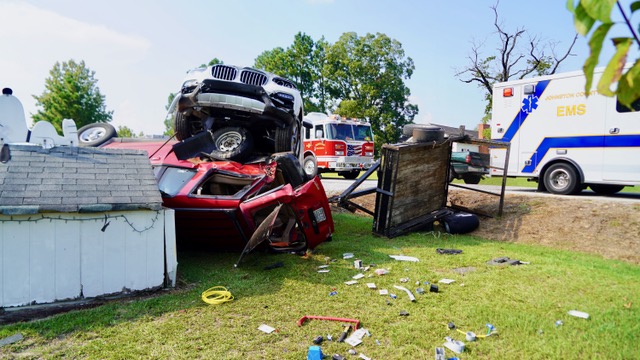 The BMW ran off the roadway and struck a ditch culvert and the right side of the Ford, before coming to rest on top of the Ford SUV after impact.