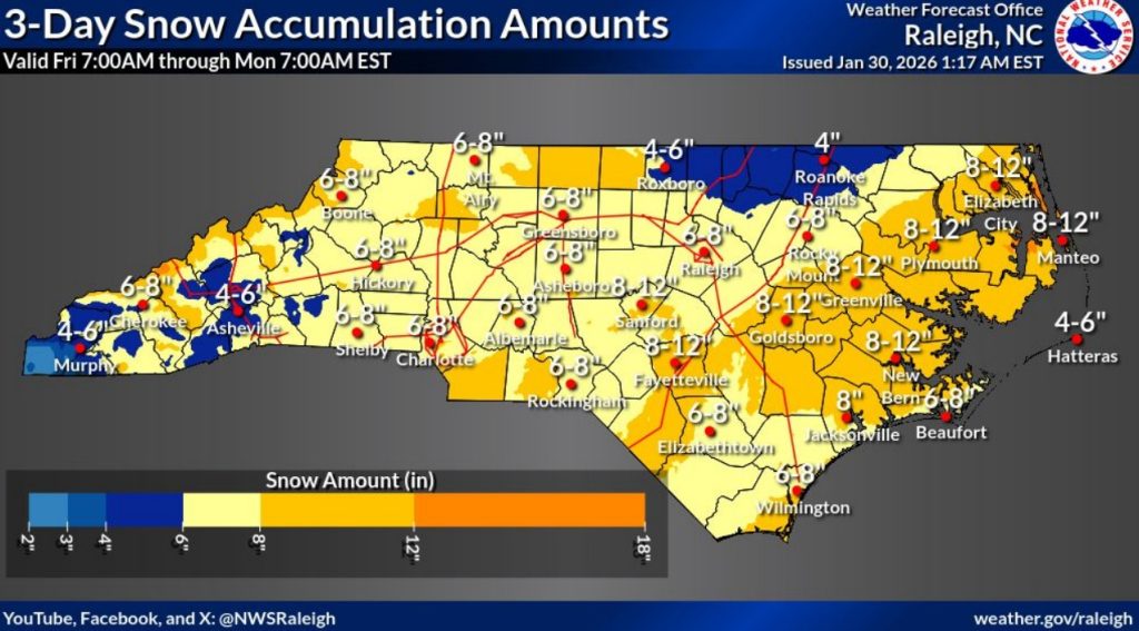 The National Weather Service in Raleigh said snowfall totals of 4 to 8 inches are expected across much of central North Carolina, including Johnston County. Localized areas could see significantly higher totals if narrow bands of heavier snow develop, while other areas may receive less snow than forecast. Forecasters stressed that exact placement of heavier snow bands remains uncertain and could shift with later updates.