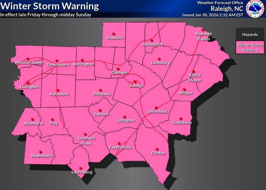 JOHNSTON COUNTY — Johnston County is under a Winter Storm Warning from 10:00 P.M. Friday through 1:00 P.M. Sunday, with forecasters calling for heavy snow, strong winds and a prolonged period of dangerous cold that could affect travel, utilities and daily life across the county.
